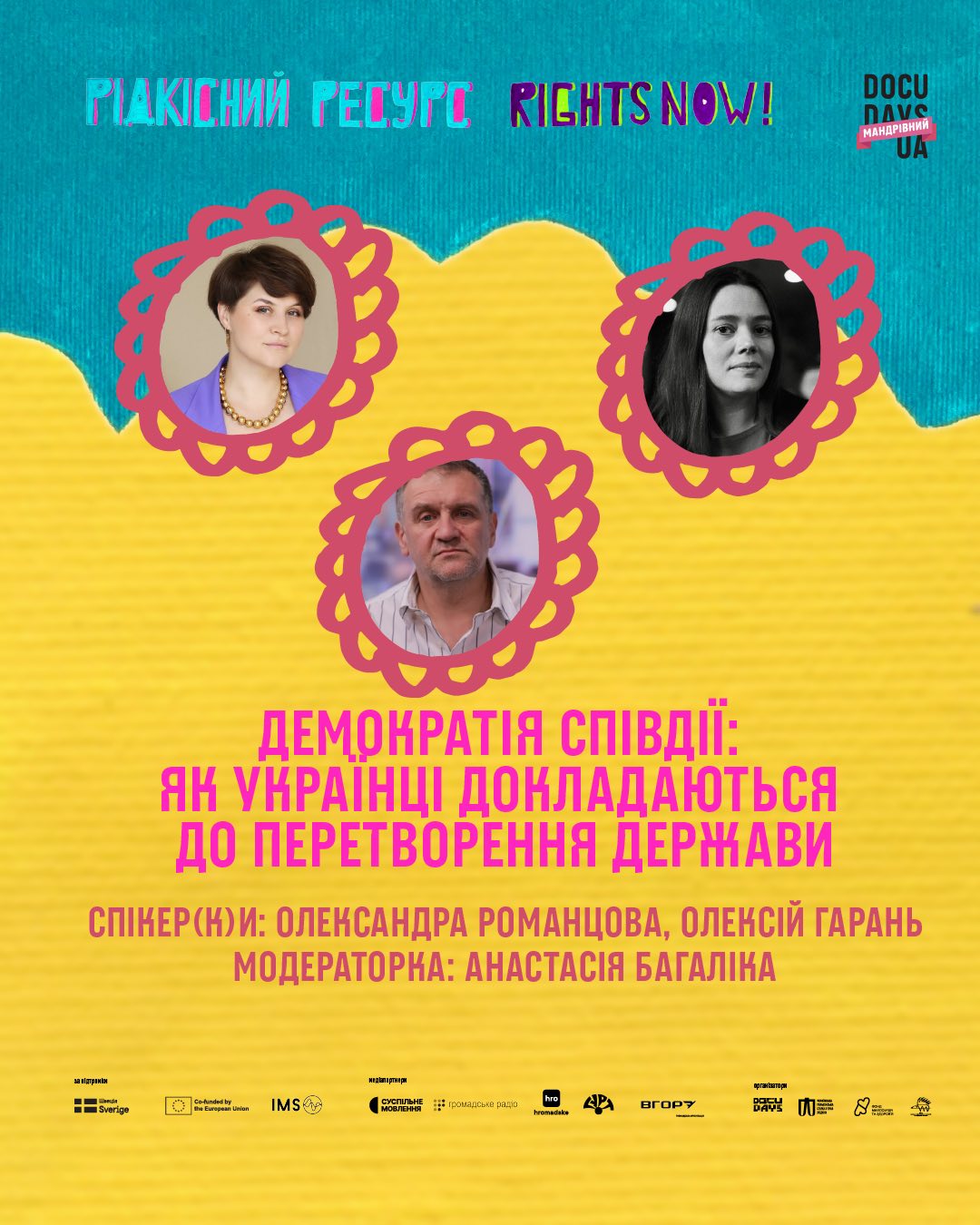 Як зберегти демократичні принципи під час війни? Як громадянське суспільство змінює державу зсередини? І чому участь кожного — від волонтера до депутата місцевої ради — є основою нашої стійкості? Про це говорили учасники дискусії «Демократія співдії», яка відбулася в межах Мандрівного Docudays UA. У розмові взяли участь Олександра Романцова, виконавча директорка Центру громадянських свобод і лавреатка Нобелівської премії миру, та Олексій Гарань, доктор політичних наук, професор НаУКМА, науковий директор Фонду «Демократичні ініціативи». Модерувала дискусію журналістка Анастасія Багаліка.