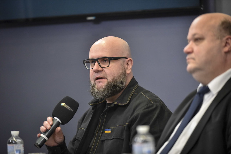 Модератор заходу, в.о. виконавчого директора Фонду «Демократичні ініціативи» ім. Ілька Кучеріва. Тарас Жовтенко у вступному слові наголосив, що метою зустрічі є додати експертності й фаховості до обговорення питання ядерного статусу України та ролі ядерного шантажу в агресії Росії.