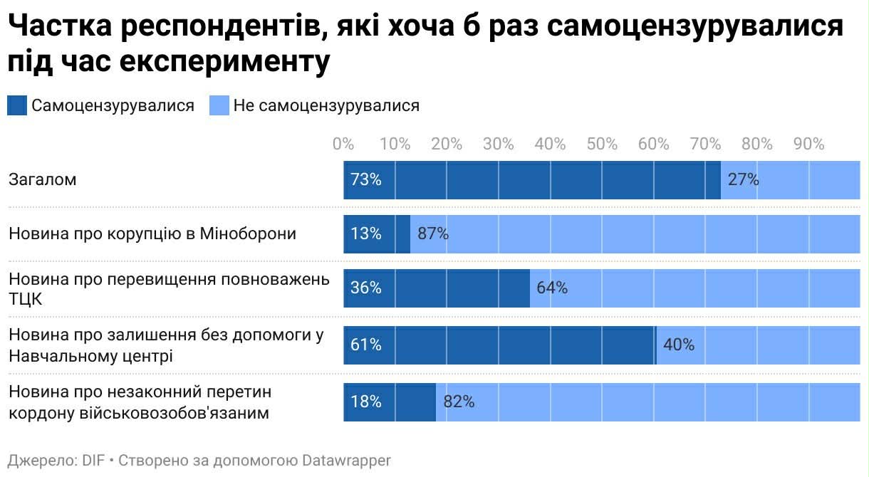 Ми пропонували їм новини, подібні до тих, що з’являються в інформаційному просторі, і запитували, чи готові вони їх публікувати. Йшлося, зокрема, про корупцію, проблеми в Міністерстві оборони, діяльність ТЦК. Близько 70 відсотків журналістів зізналися, що в окремих випадках були б готові до самоцензури – через побоювання нашкодити суспільній єдності або через неможливість швидко перевірити всю інформацію.