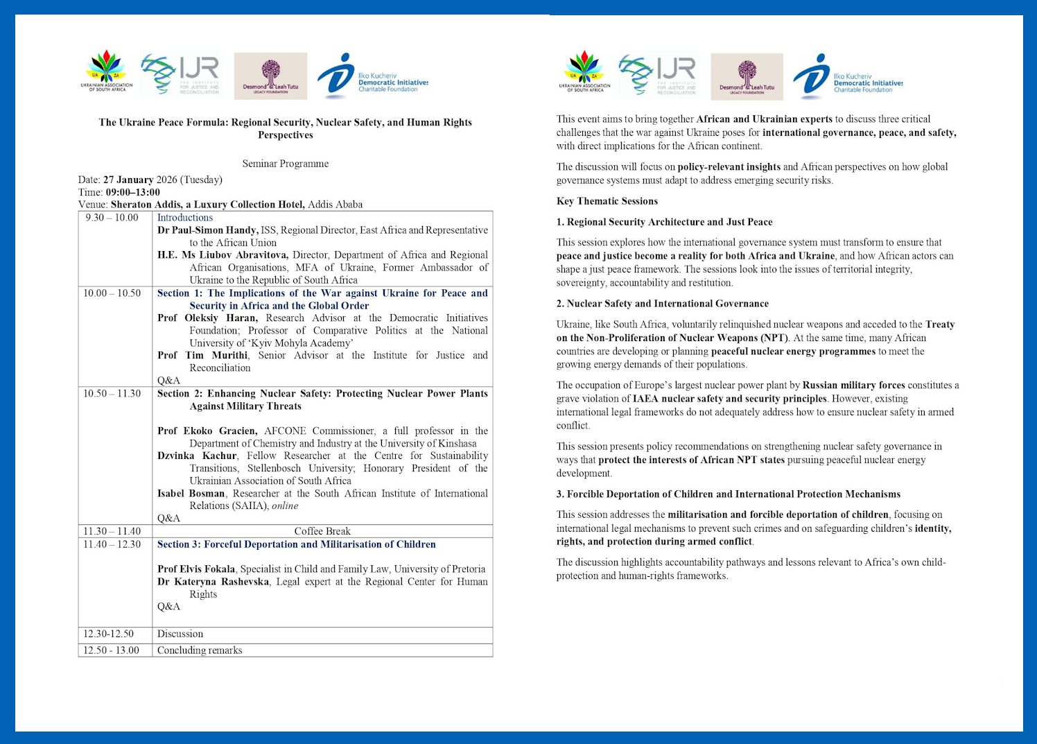 The seminar is part of the activities organised by a collaborative platform for South African and Ukrainian experts, which was established in December 2023 by four civil society organisations: the Institute for Justice and Reconciliation, the Desmond and Leah Tutu Legacy Foundation, the Ilko Kucheriv Democratic Initiatives Foundation, and the Ukrainian Association of South Africa. Academic and civil society stakeholders within this initiative focus on key areas linked to the African Peace Mission and Ukraine Peace Formula.
