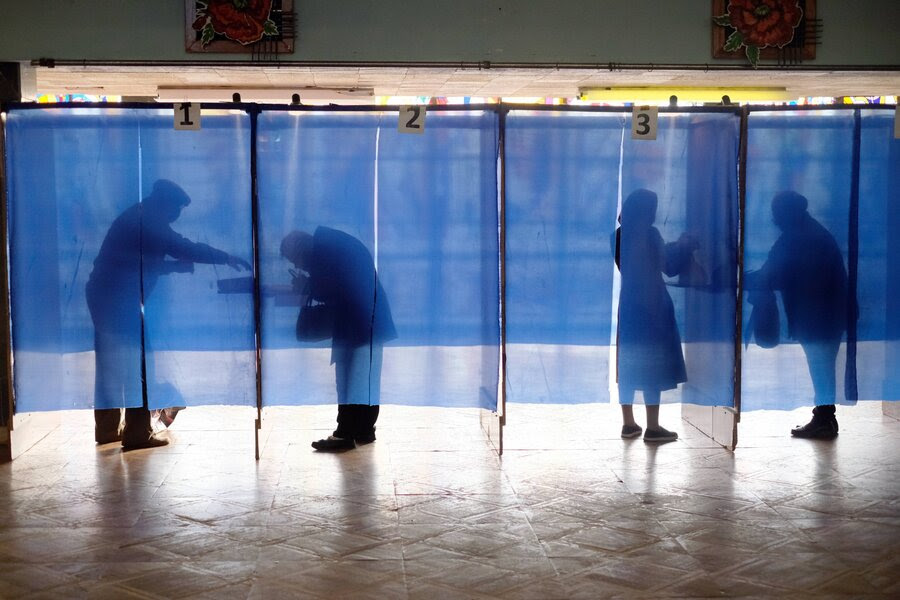Voters make their choices inside the booths at a polling station as the 2020 Ukrainian local elections take place in Rubizhne (IMAGO / Ukrinform)
